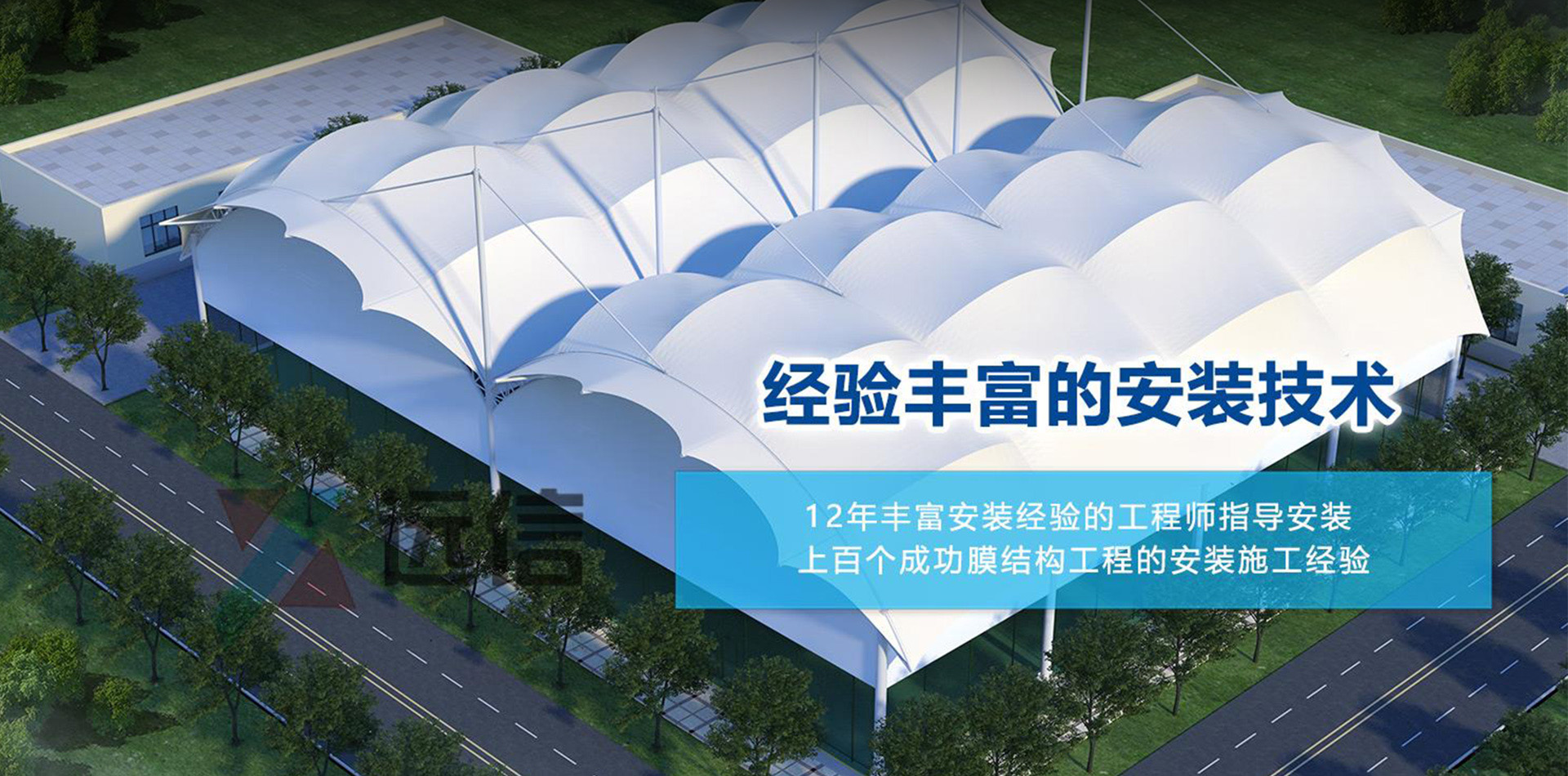3.從結(jié)構(gòu)設(shè)計上降低膜材安裝難度選用膜材均為國產(chǎn)或進(jìn)口優(yōu)質(zhì)膜材料,高強(qiáng)拉力,優(yōu)質(zhì)抵抗老化涂層